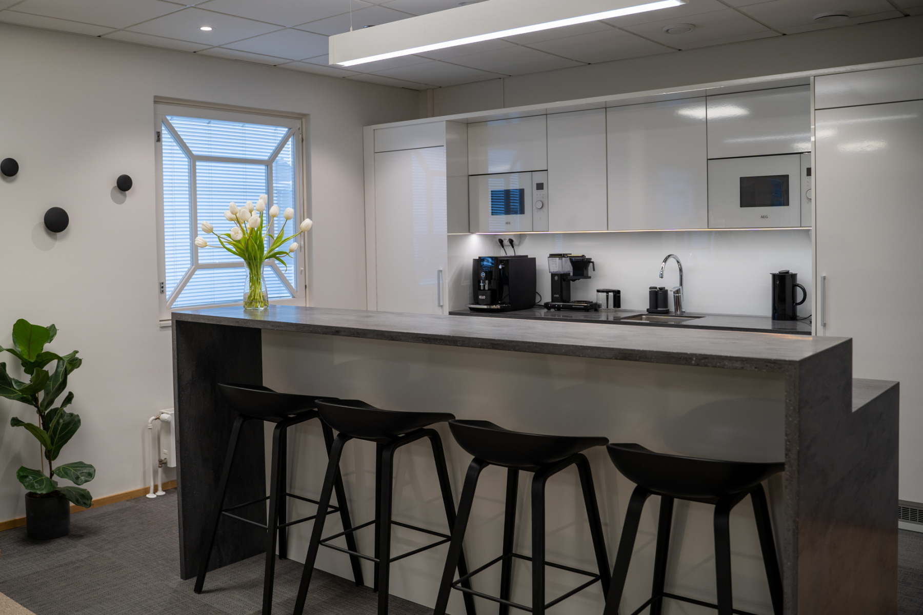Uudessa toimistossa hyödynnettiin pitkälti tilan edellisen käyttäjän ratkaisuja, kuten työpöytiä. Remontteja tilaan ei tarvinnut ennen muuttoa tehdä, sillä toimisto oli uudistettu vain vajaat kaksi vuotta aikaisemmin neutraalin tyylikkäin värein.