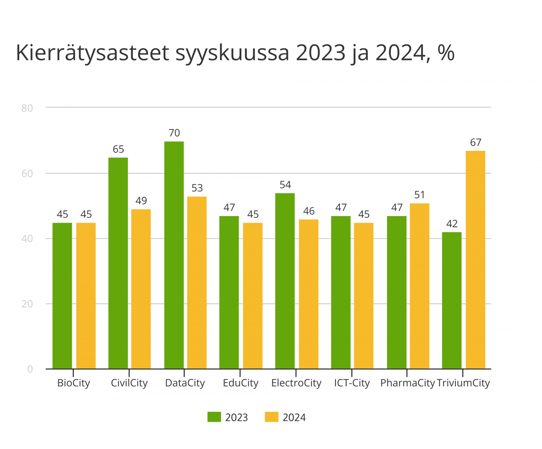 – Suoraan sanottuna järkyttävältä. Kilpailussa mukana olevista rakennuksista vain PharmaCityssä ja TriviumCityssä kierrätysastetta on saatu nostettua vuoden takaisesta. BioCityssä kierrätysaste on pysynyt samana eli 45 prosentissa, mutta CivilCityssä, DataCityssä, EduCityssä, ElectroCityssä ja ICT-Cityssä kierrätysaste on jopa huonontunut, Tuominen ihmettelee.