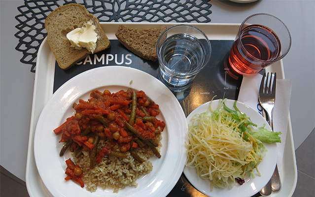 Testipäivänä tarjolla oli jauhelihakebakoita ja keitettyjä perunoita chilimajoneesilla, kikherne-kasviscurrya täysjyväriisillä, kasvis-borssikeittoa sekä broilerisalaattia. Testaajamme Leena päätyi hetken vaihtoehtoja punnittuaan kebakoihin ja Terhi kikherne-kasvicurryyn.