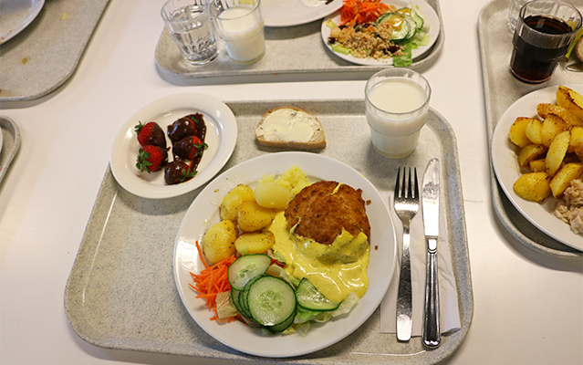 Sari valitsi lounaaksi paneroitua kievin kanaa currymajoneesilla sekä tiskiltä silmiin osuneen chilisuklaa-mansikka -jälkiruuan. Ulla ja Terhi testasivat päivän kasvisvaihtoehtoa, joka oli kasvispihvejä kermaviili- tai kookoskastikkeella. Lisukkeeksi kaikkiin ruokiin oli tarjolla keitettyjä tai paistettuja perunoita sekä riisiä.