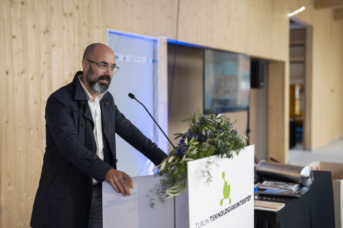 Teknologiakiinteistöjen rakennuttamisjohtaja Miika Tuominen korosti puheessaan rakennuksen ympäristöarvoja.