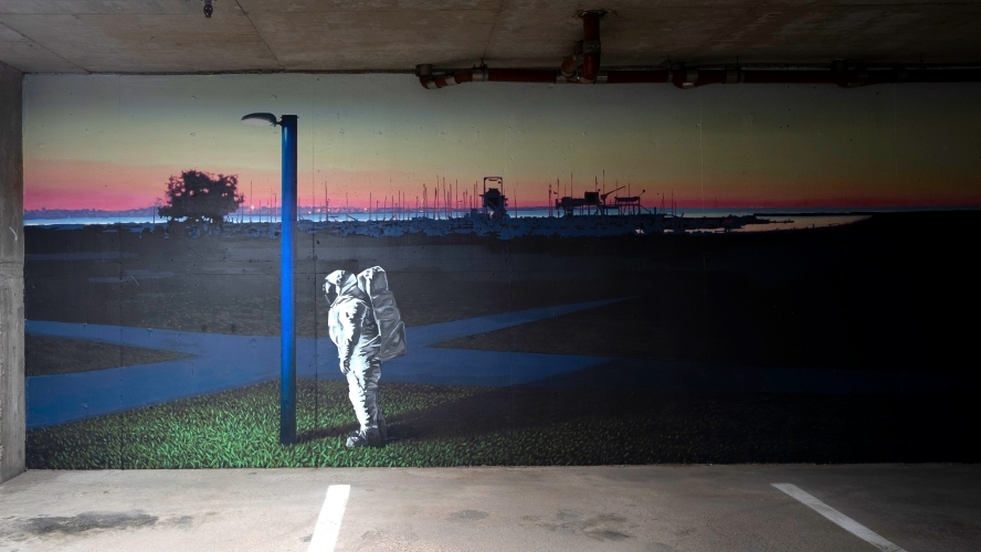 Maalauksen astronautti on eksynyt outoon paikkaan: Hänen oli tarkoitus ihailla maansa lippua, mutta onkin eksynyt rannalle katulampun alle. Teoksen ideana on pienuuden tunne, joka yhdistää astronauttia avaruudessa ja ketä tahansa vieraassa paikassa olijaa.