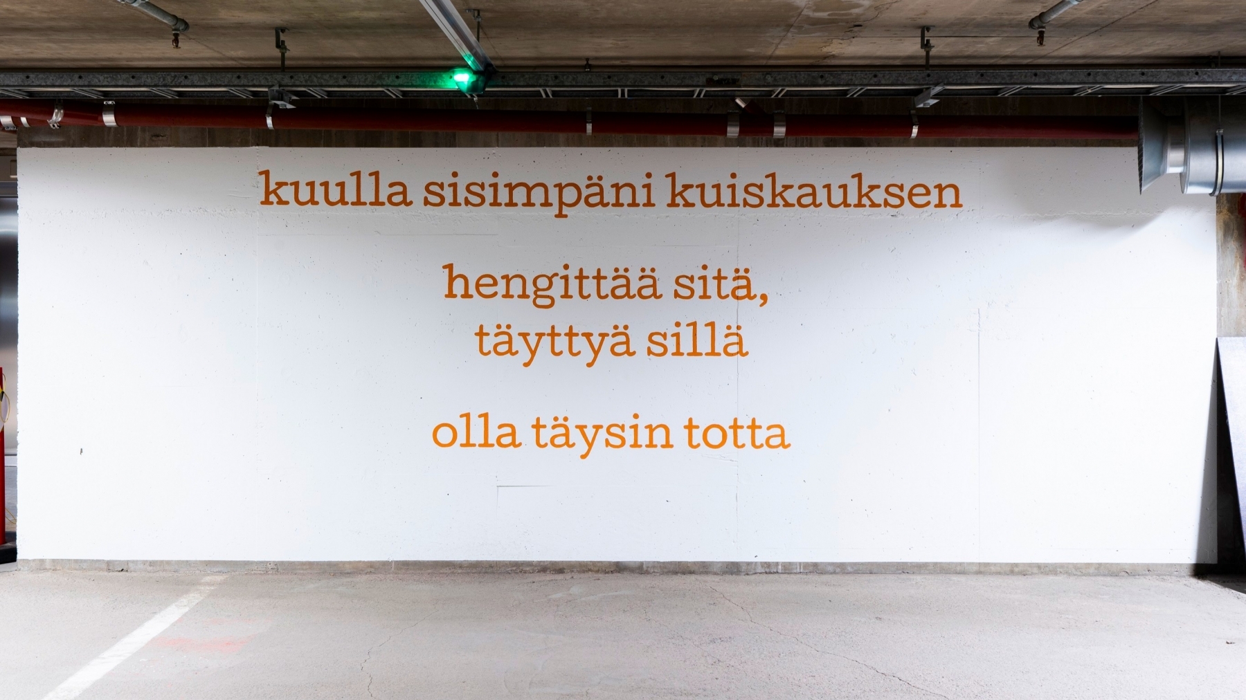 Teoksen runo muistuttaa pysähtymisen ja itsensä kuuntelun tärkeydestä. Arki, kiire, maailman tapahtumat, muiden hyväksynnän kaipuu tai hylkäämisen pelko peittävät helposti oman sisäisen äänen ja aitouden alleen, vaikka juuri sisimpämme on meissä olennaista.